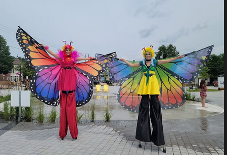 Venez rencontrer les géants du haut de leurs échasses, ces acrobates et magnifiques amuseurs de rue : Tigré du Canada et Belle Dame papillons !